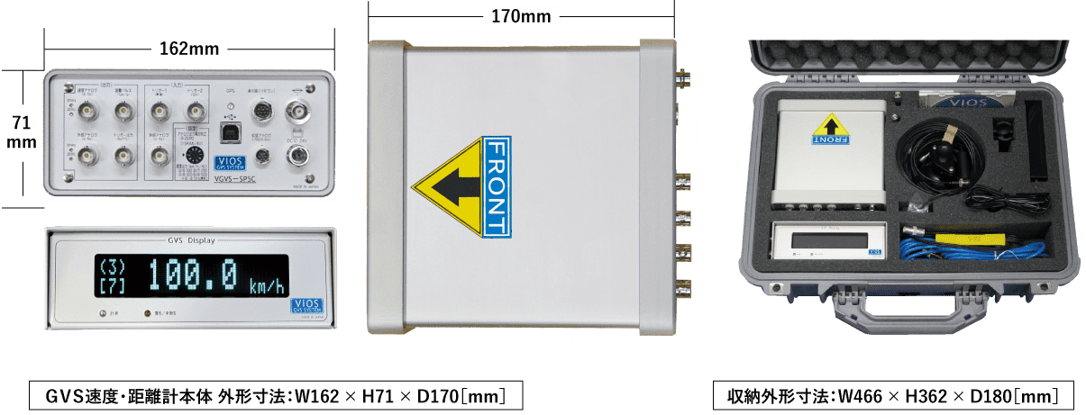 GVS速度・距離計本体・表示器・操作リモコン・表示器/ リモコンケーブル・USBケーブル・ブレーキトリガー用フットセンサー・電源シガープラグ・ バッテリーコード・BNCケーブル・サクションホルダ・アーム・セットドライバ(大)・(小)・ 計測ソフトインストールCD・USBドライバCD・取扱説明書・収納ケース・GVSアンテナ |